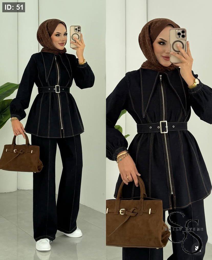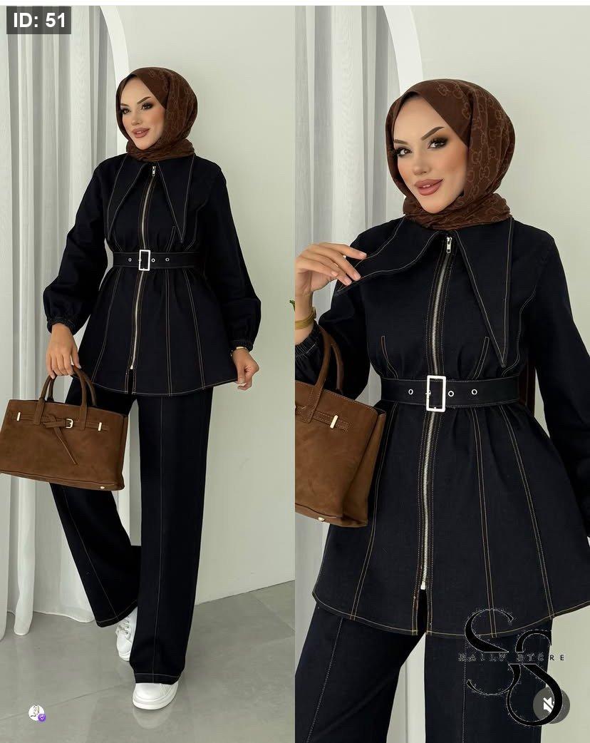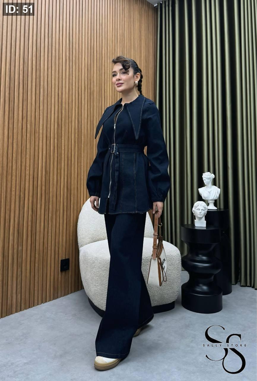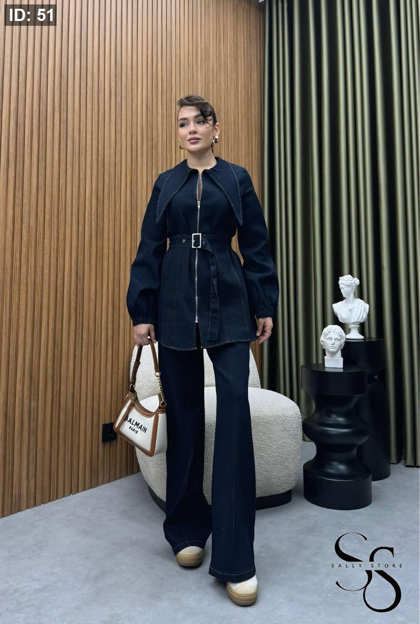 طقم جينز كحلي بنطلون وجاكيت مع حزام