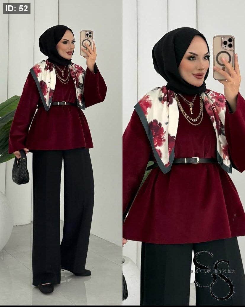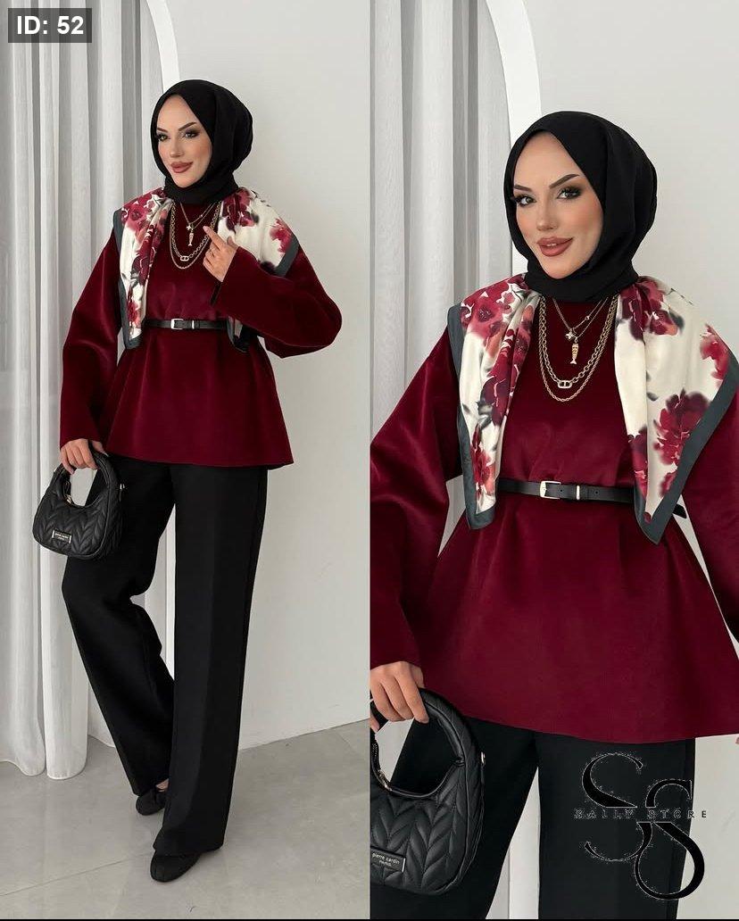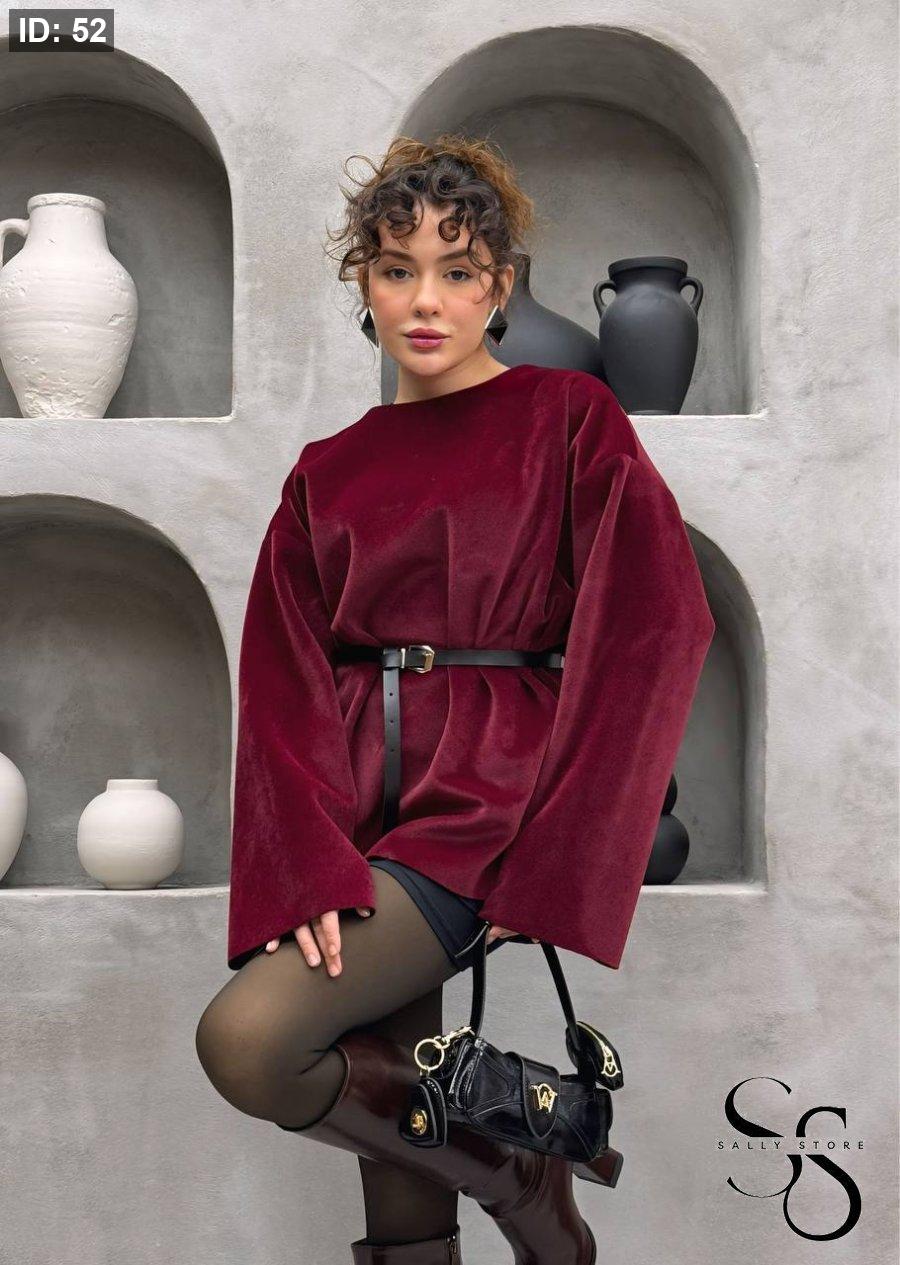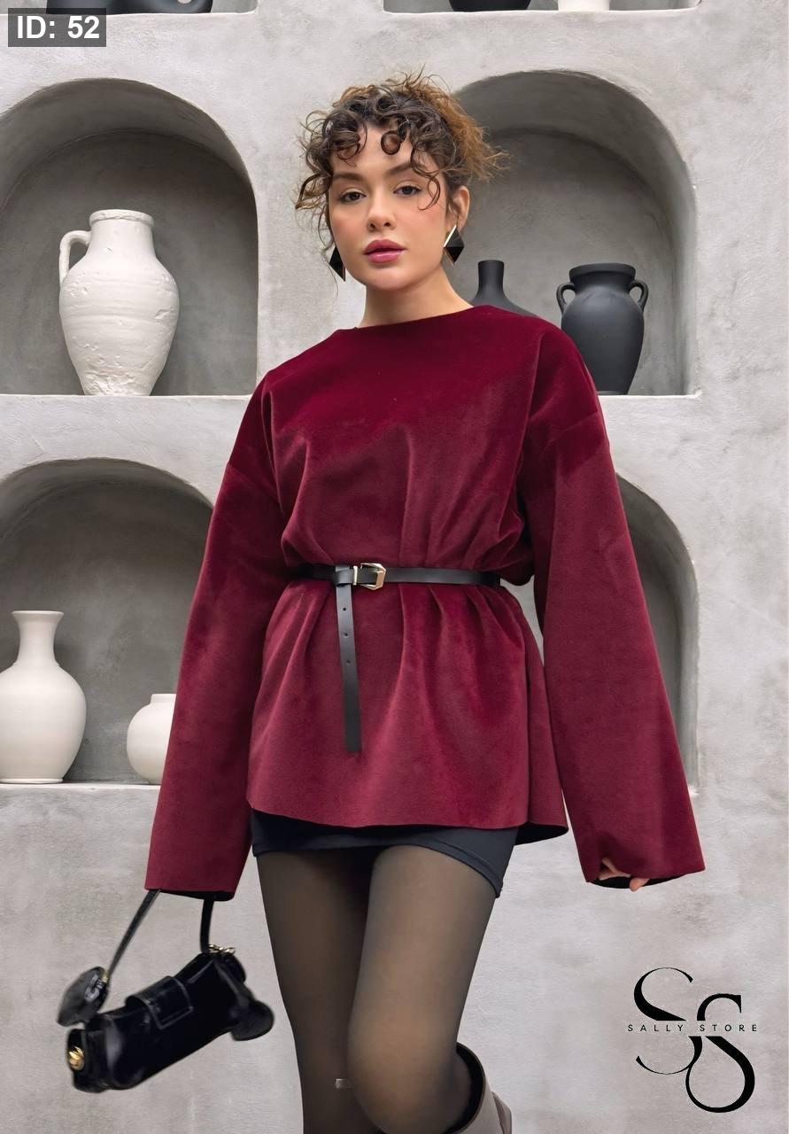 بلوزة مخمل بوردو مع حزام جلد أسود